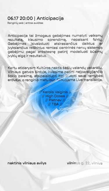 Naktinis Vilniaus Avilys was an open cultural space in Vilnius dedicated to emerging creators and youth. It was founded for artists, youth, and non-profit organizations to come together, experiment, share ideas, and create new forms of expression. It also serves as a hub for youth organizations and policy initiatives, connecting creativity with social impact.